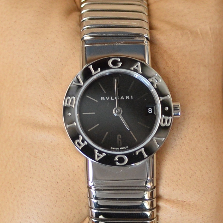 ブルガリのトゥボガスをお買取させていただきました。ブルガリのレディースウォッチの定番モデルで、現行品はベルト部分に同じ蛇腹模様のデザインを踏襲しながら、ケース部分も蛇の頭部のフォルムとなったセルペンティ仕様となっています。旧型から新型まで共通して、腕時計でありながらバックルが存在しないバングルが特徴となっています。今回ご依頼いただいたお品物は古めのモデルでステンレス素材のトゥボガスです。中古品としては状態は良好な部類ではありますが、どうしても中古腕時計の市場においては人気の高いモデルではなく、状態等を考慮し3万円にてお買取させていただきました。