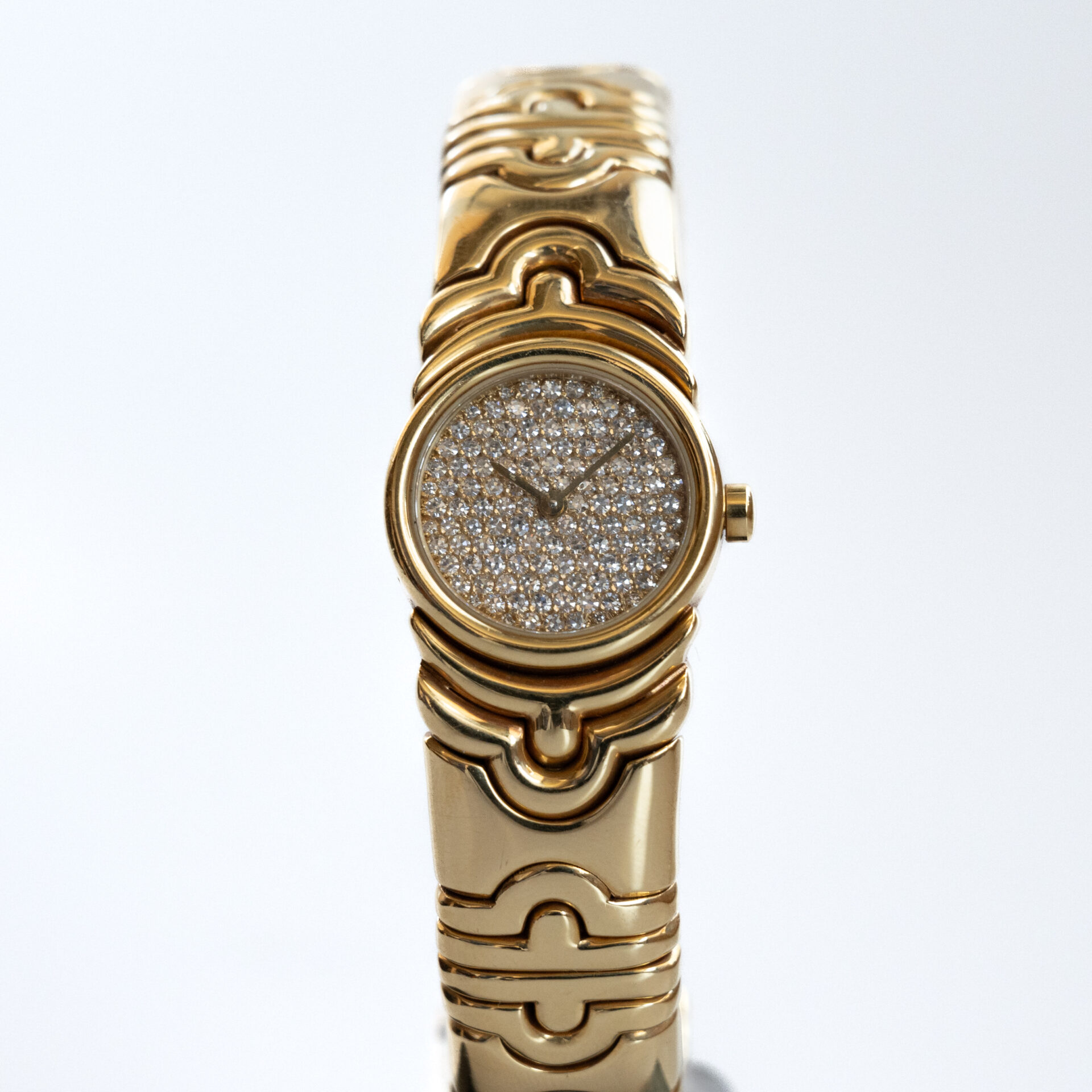 ブルガリのパレンテシをお買取させていただきました。パレンテシはブルガリの古くからあるモチーフで、腕時計以外にもリングやネックレスなど多数のアイテムが展開されています。現在ではメインコレクションというほどではありませんが、少数で展開され続けているモチーフです。今回ご依頼いただいたお品物は、現行品では展開されていない腕時計のアイテムで、K18素材を用いたモデルです。ブルガリの中でも定番品で人気の高いセルペンティなどのシリーズと比較すると、お値段がつきづらいアイテムではありますが、近年は金相場の高騰などもあり、ヴィンテージのK18製アイテムの買取価格も大幅に高騰しております。