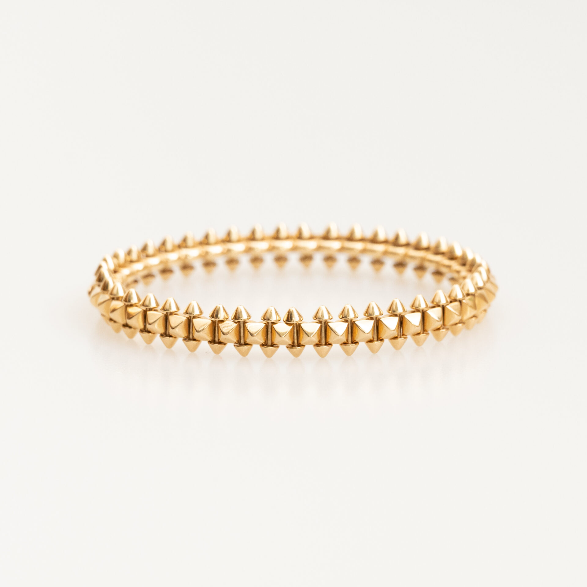 カルティエのクラッシュドゥカルティエブレスレットをお買取させていただきました。現行品としても展開されているモデルではありますが、人気の高い定番のラブブレスやジュストアンクルブレスレットと比較すると中古市場ではやや人気が低い品となります。今回ご依頼いただいたお品物は使用感も少なく美品とご評価させていただきました。カルティエのジュエリー類に関しては、サイズの違いによって金額も大きく変わるほか、リングやバングルなどは個々の指周りや腕まわりのサイズによっても使用される金属の重さが変わるため査定に影響してきます。最新の相場を考慮し60万円にてお買取させていただきました。