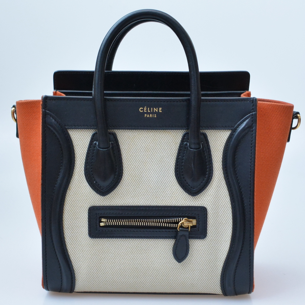 セリーヌのラゲージナノショッパーをお買取させていただきました。ラゲージバッグはブームはやや過ぎ去った印象ですが、中古市場ではまだまだ人気が高くセリーヌの中では高値がつきやすいモデルの一つです。サイズ展開が豊富ですが、唯一ショルダーストラップが付属して2WAY利用が可能なナノショッパーがもっとも人気です。今回ご依頼いただいたお品物はトリコロールカラーのナノショッパーです。状態に関しては全体的に小傷が見られた点に加えて、正面のキャンバス生地にシミ汚れが見られた点が大きくマイナスとなってしまいました。