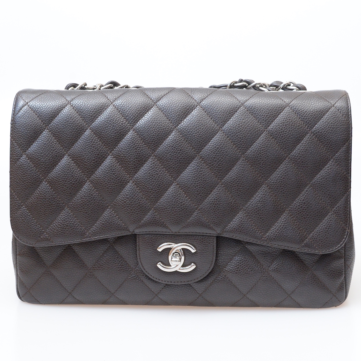 シャネルの30cmチェーンショルダーをお買取させていただきました。シャネルのアイコンモデルですが、定番チェーンショルダーにも細かな仕様などによって買取価格は変わってきます。今回ご依頼いただいたお品物は幅30cmの大きめのモデルで、かつシングルフラップと呼ばれる二重蓋になっていないタイプです。若干相場が落ちてしまうものの、キャビアスキンのチェーンショルダーは非常に相場が高騰しているため、あまり関係ないと感じる方も多いのではと思います。お色はダークブラウンで珍しいと言えますが、ブラックよりは少し安めとなってしまいます。最後に状態に関してですが、少し角スレであったり内側部分に使用感などもありましたが、Bランクとまでは行かずABランク相当とご評価させていただきました。