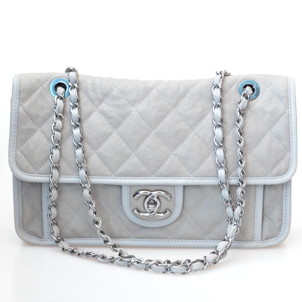 シャネルのフレンチリビエラチェーンショルダーをお買取させていただきました。このモデルは主にパンチングレザーのモデルが多く、それ以外はキャビアスキンモデルの展開が主流となっていたやや珍しいチェーンショルダーバッグとなります。パンチングレザーモデルの方が流通数はやや多めな傾向にあるものの、キャビアスキンモデルの方が買取相場は高くなっています。今回ご依頼いただいたお品物はグレーの薄い色味ではありますが、ほとんど使用感が見られず状態に関しても高くご評価させていただきました。