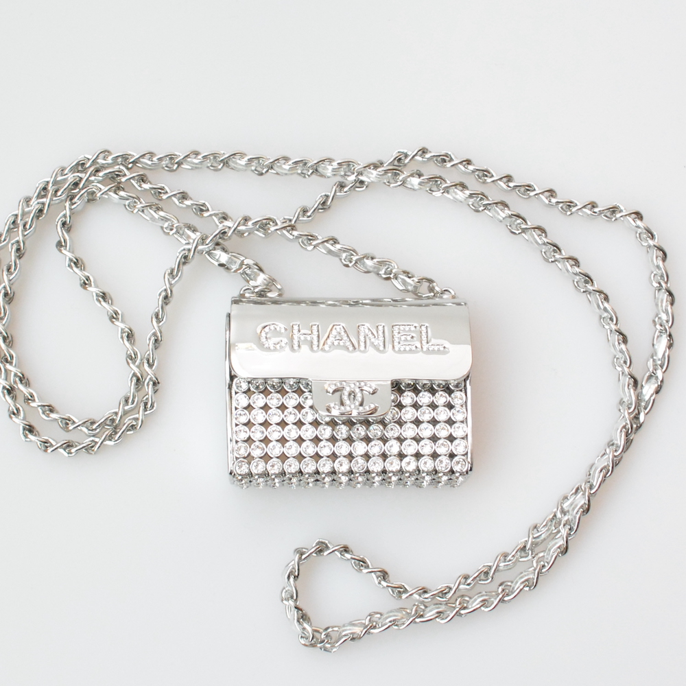 シャネルのチェーンバッグ型ネックレスをお買取させていただきました。こちらは新作モデルで定番のフラップバッグをモチーフとしたメタル製のネックレスです。近年のシャネル製品は定価が非常に高額となっており、その中でもこちらのモデルはトップクラスに高価な品となります。バッグと同じレザー編み込みのチェーンを採用し、トップ部分は定番のフラップバッグと同じように開閉することも可能な豪華な仕様です。ただし定価が高価すぎることもあって、現状の相場ですと37万円が上限とご評価させていただいております。