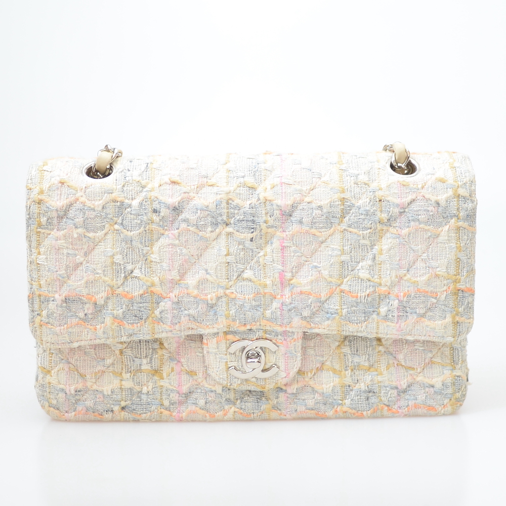 シャネルのダブルフラップチェーンショルダーをお買取させていただきました。ツイード素材のモデルに関しては、通常のレザー素材と比較するとやや中古相場が安い傾向にあります。今回ご依頼いただいたお品物は目立った傷や汚れは少ないものの、若干素材の色焼けのようなものが見られ、その点に関しては減額対象となってしまいました。レザー素材と異なりケアが難しい素材のため、状態の良し悪しが査定に大きく影響するポイントとなります。