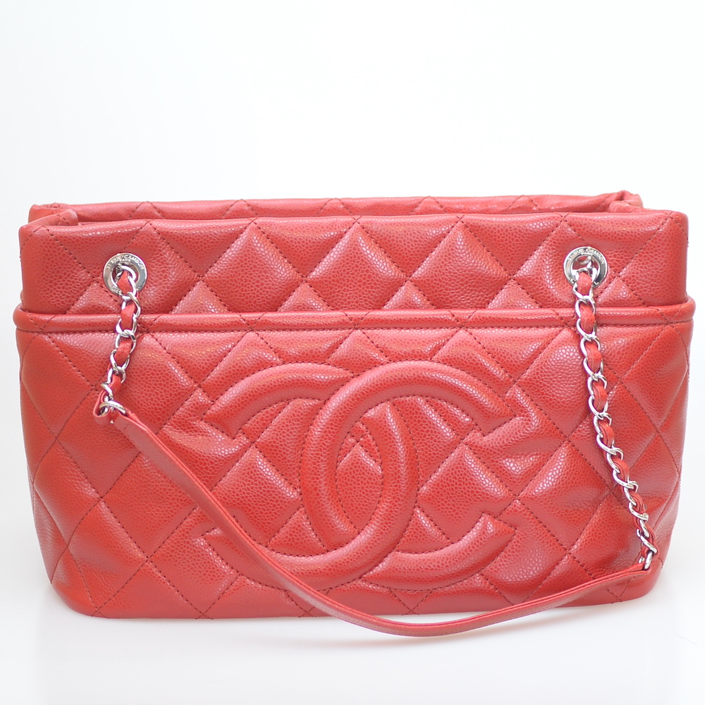 シャネルのチェーントートをお買取させていただきました。シャネルのチェーントートは定番のGSTトートなどが有名ですが、形はかなり似ていますが定番モデルとは少し仕様が異なる珍しい品です。レッドでキャビアスキンのモデルは人気が高いものの、キャビアスキンの中では柔らかめで一時期ラインナップされていた「ソフトキャビア」と呼ばれる素材となっており、中古市場でのトレンドにおいてはやや相場が下がってしまう傾向にあります。状態に関しては角や縁などにキャビアスキン特有の擦れ傷などが見られたものの、その他部分や総合的には美品であるとご評価させていただきました。