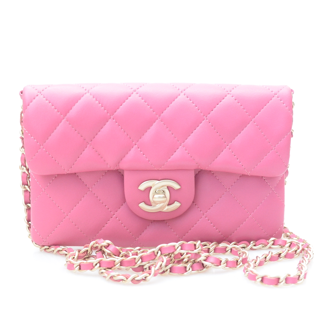 シャネルのミニチェーンショルダーをお買取させていただきました。写真で見ると通常のミニマトラッセ型と同じですが、こちらのモデルは薄型のマチがないタイプとなります。多少の小物やカード類などは収納できますが、バッグというよりは小型のポーチといった用途となります。名称はチェーンショルダーですが、チェーンウォレットのようなモデルです。今回ご依頼いただいたお品物はピンク系のカラーにラムスキンのモデルで、ややキャビアスキンと比較すると買取価格が下がってしまいますが、状態が非常に良好な点を高くご評価させていただきました。