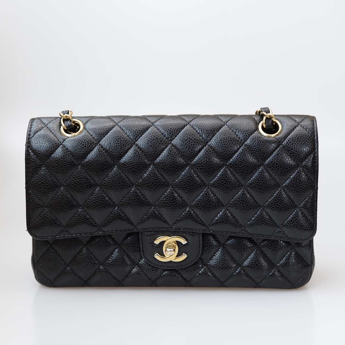 ダブルフラップ チェーンショルダー(ブラック・キャビアスキン)