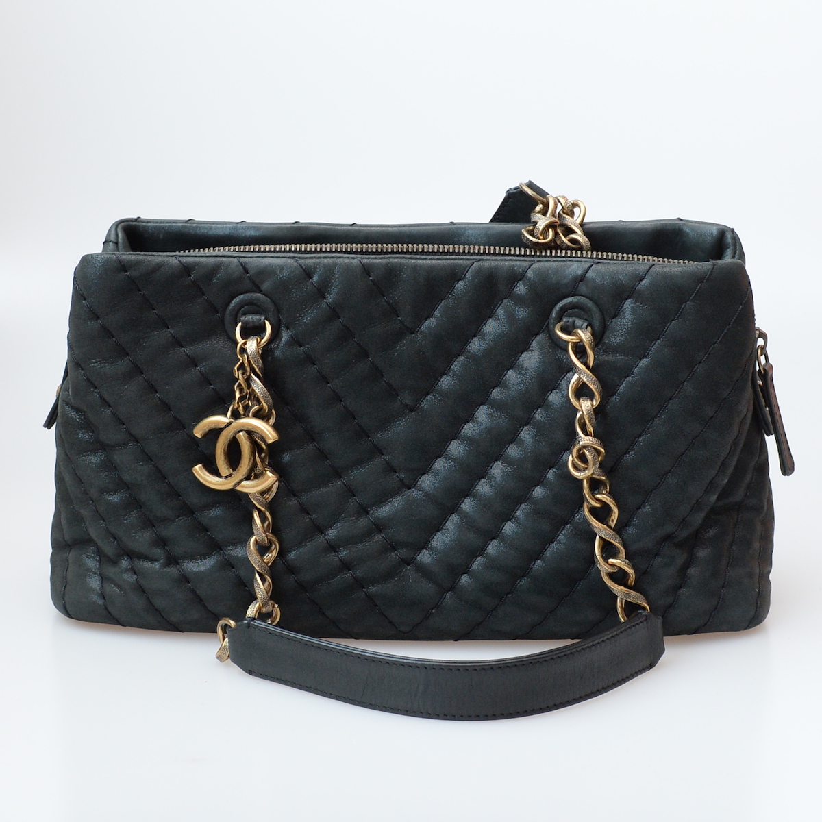 シャネルのチェーントートバッグをお買取させていただきました。チェーントートといってもハンドバッグのような小ぶりなサイズ感で、使い勝手がよく人気が高いモデルの一つです。シェブロンと呼ばれるVステッチ柄が特徴となっていて、少し硬めのラムスキンが使われている点は比較的新しめのシャネル製品の傾向かなと思います。シャネルのバッグは一般的なチェーンショルダーバッグがもっとも需要が高く買取利率も高くなっています。それ以外だと今回ご依頼いただいたような持ち手がチェーンになっているハンドバッグやトートバッグの人気が高いです。ややスレや小キズなどがあるものの、全体的には美品と判断させていただき145,000円にてお買取させていただきました。