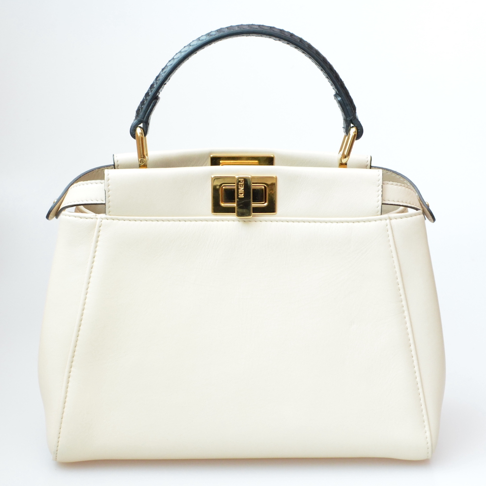 フェンディのミニピーカブーをお買取させていただきました。フェンディのアイコンバッグピーカブーのミニサイズとなっていて、同モデルで中古市場では一番人気の高いサイズとなっております。近年比較的人気の高いハンドルがパイソン素材となっているモデルで、アイボリーとゴールド色の金具の組み合わせは高くご評価させていただきました。やや傷や汚れは見られたものの、全体的には美品といったABでのご評価とさせていただきました。