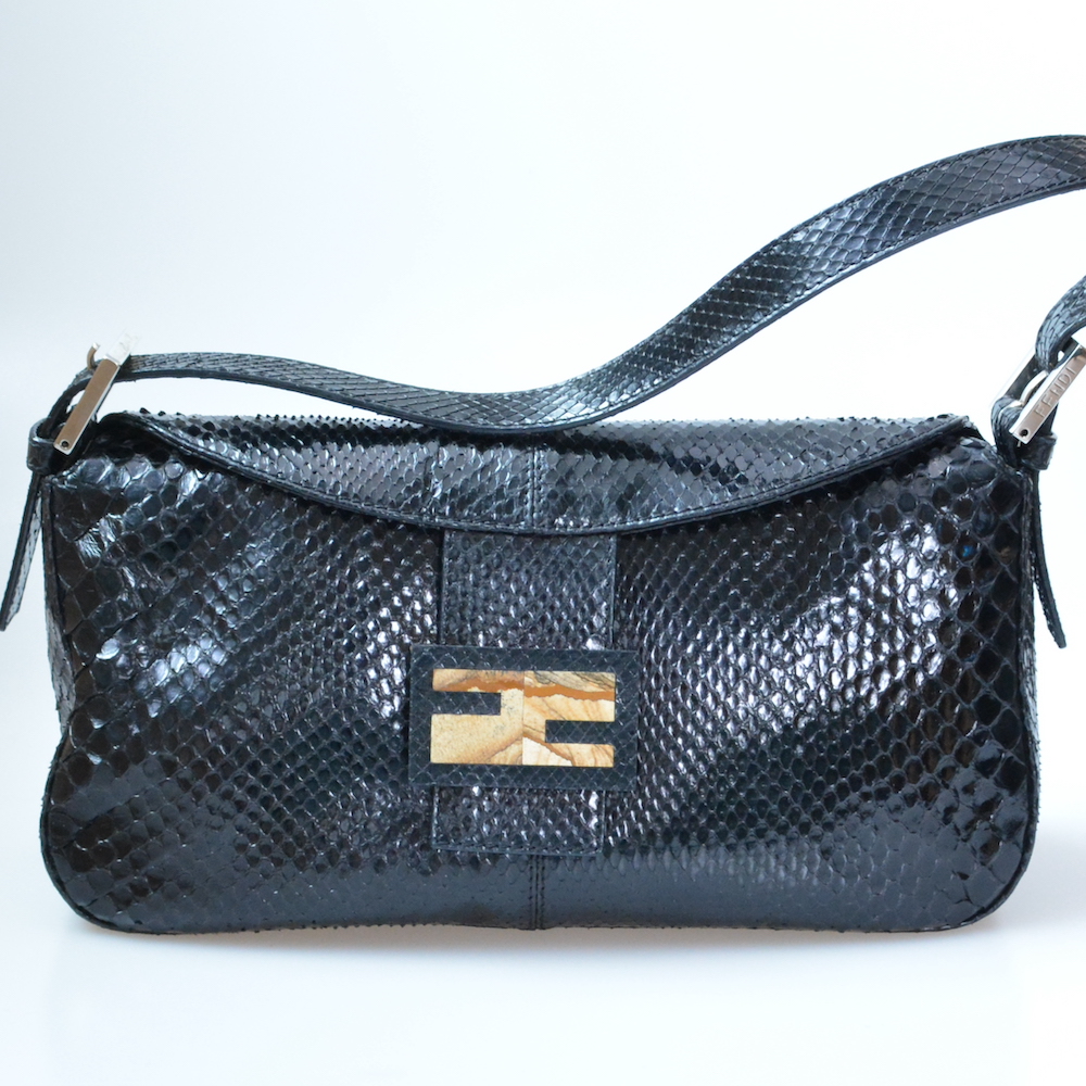 フェンディのマンマバゲットをお買取させていただきました。マンマバゲットは古いフェンディの定番品として中古市場では今でも人気が高いモデルです。近年は新たにバゲットバッグとして復刻されたことも話題となりました。さまざまな素材や柄で展開が豊富なマンマバゲットですが、今回ご依頼いただいたお品物はブラックでパイソン素材を使用した珍しいモデルでした。エキゾチックレザーは繊細で経年劣化が起こりやすい傾向にありますが、傷なども少なく色焼け等も見られなかったことから、状態もABランクと高くご評価させていただきました。