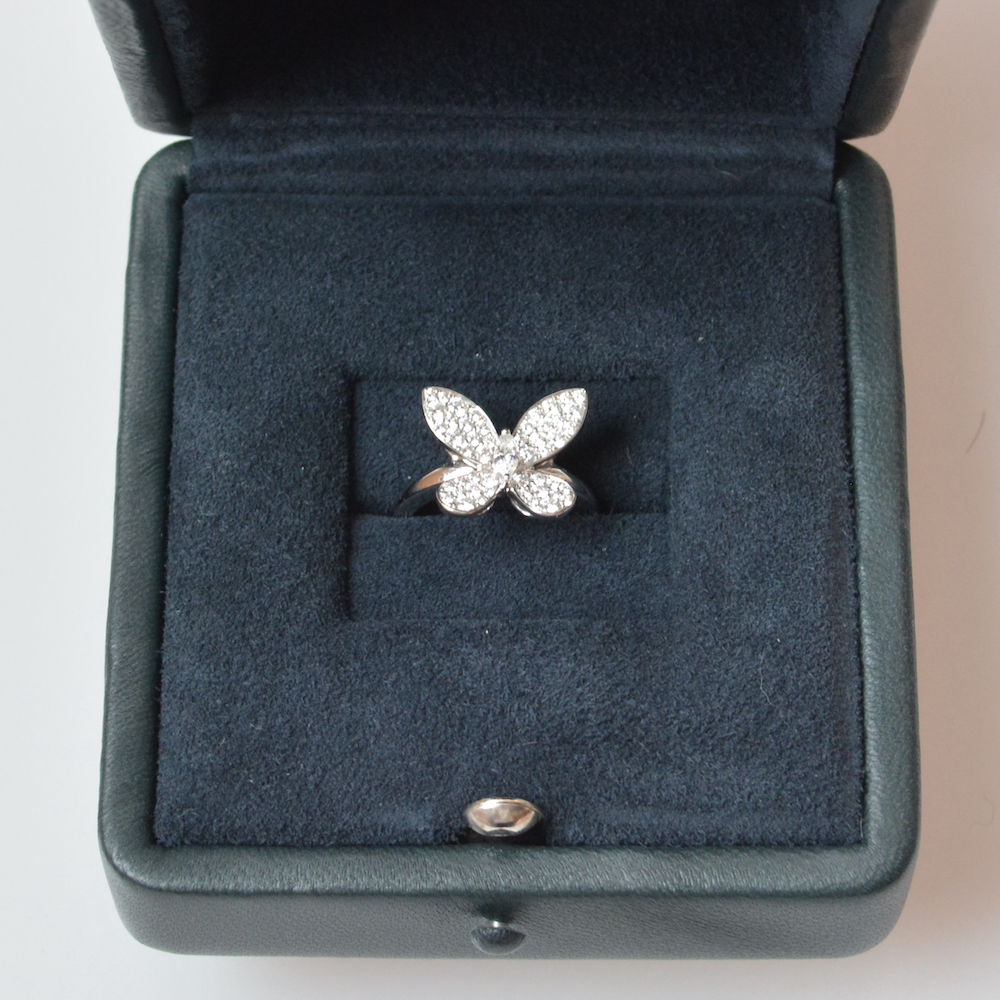 グラフのバタフライダイヤモンドミニリングをお買取させていただきました。グラフの代表的なモチーフの一つでもあるバタフライラインのダイヤモンドリングとなります。ミニサイズのモデルですが、全体で0.55カラットのハイクオリティなダイヤモンドを配置したハイジュエリー製品です。使用に伴う小傷などがやや見られましたが、保証書なども全て揃った状態でのお査定でしたので高くご評価させていただきました。