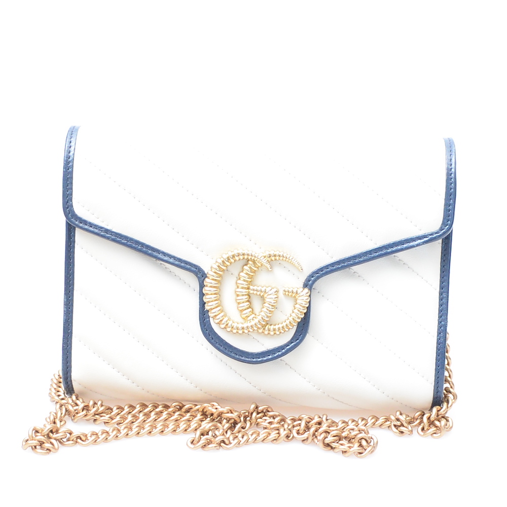 グッチのGGマーモントラインのチェーンショルダーバッグをお買取させていただきました。GGマーモントは比較的新しめに登場したシリーズで近年のグッチを代表とするラインの一つとなっています。定番とされるモデルよりもやや珍しいレター型のチェーンショルダーバッグですが、中古市場でも人気が高い品物とご評価させていただきました。中古品とのことでお査定させていただきましたが、拝見させていただき状態については傷等がほぼ見られない美品と判断させていただき、6万円にてお買取させていただきました。