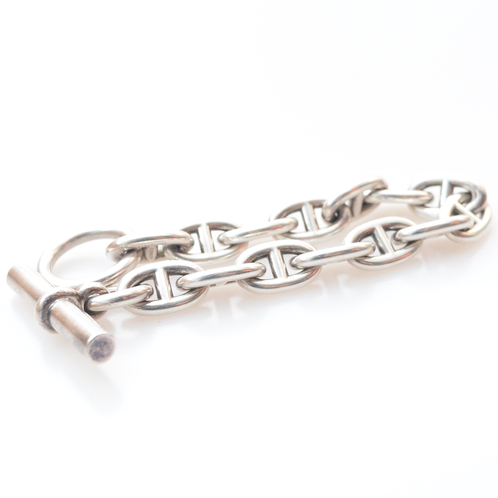 エルメスのシェーヌダンクルブレスレットPMをお買取させていただきました。シェーヌダンクルは近年メンズ需要が高く、正規店でも購入しづらいジュエリー製品の一つとなっています。シルバー製でエルメスの中でも比較的安価なことから中古市場でも需要の高い品物と位置付けられています。今回ご依頼いただいたお品物は比較的製造の古いお品物で、もっとも小型のPMサイズとなっております。腕周りがかなり細くレディースサイズだったことなどを考慮し、やや平均相場よりも安めのご評価となってしまいました。