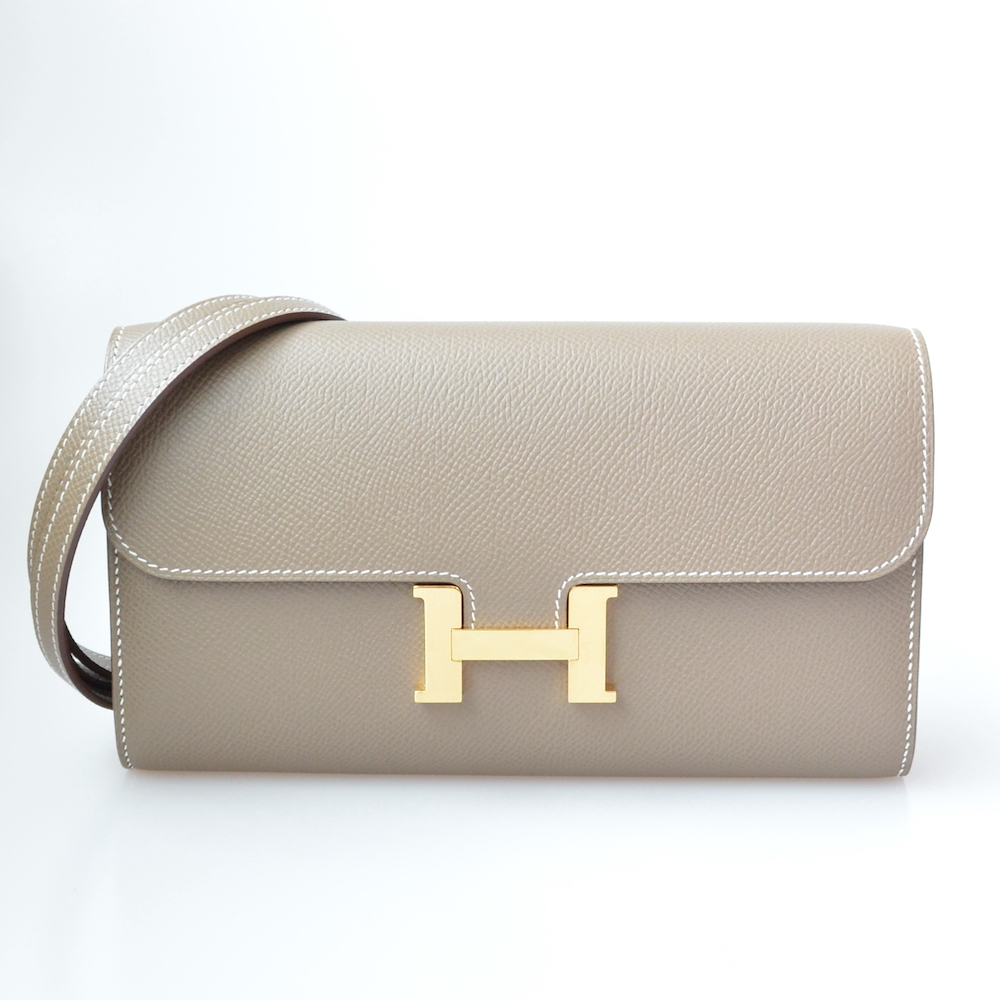 エルメスのコンスタンストゥーゴーをお買取させていただきました。コンスタンスウォレットにショルダーストラップが付属する近年登場したトゥーゴーモデルで、同時期に「ケリートゥーゴー」も登場しましたが、コンスタンストゥーゴーの方が中古市場では人気が高くやや高値が付きやすい傾向にあります。今回ご依頼いただいたお品物はグレー系定番カラーの「エトゥープ」でかつゴールド金具のモデルで非常に人気の高いお品物と判断させていただきました。全体的に傷や汚れが少ない美品ではありますが、正面のH型金具の部分に小傷が多く見られたためその点はマイナスのご評価となってしまいました。コンスタンストゥーゴーは発売当初と比べるとやや相場も上昇傾向にありますので、最新の相場と状態等を考慮し625,000円にてお買取させていただきました。