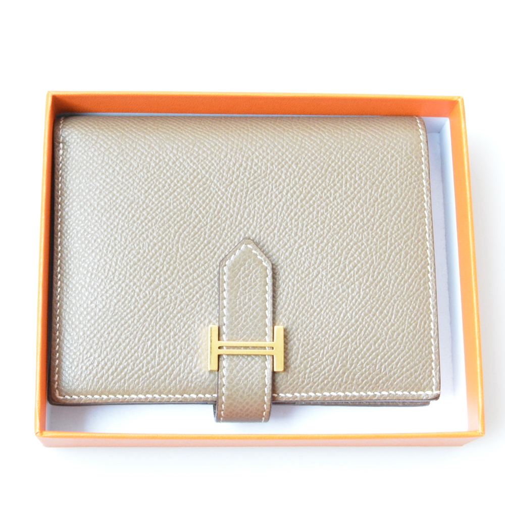 エルメスのベアンコンパクトをお買取させていただきました。エルメスの長財布の定番モデルである「ベアンスフレ」がコンパクトサイズになったモデルで、非常に人気の高いお品物となります。今回ご依頼いただいたお品物は中古品ではありましたが、全体的に使用感も少なく美品であるとご評価させていただきました。エルメスでもっとも人気の高い「エトゥープ」カラーである点や、ゴールド金具のモデルである点も高価買取できるポイントです。近年エルメスの革製品はバッグだけでなく人気のウォレットモデルも品薄状態となっていて、中古相場も高騰傾向にあります。