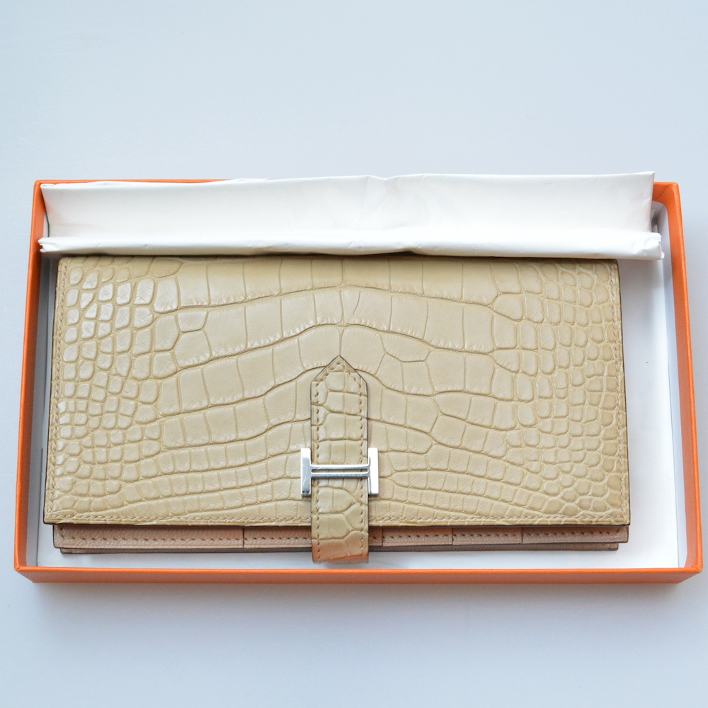 エルメスのベアンスフレクロコのモデルをお買取させていただきました。プシエールというベージュ系のカラーで主にクロコ素材でのみ展開されている珍しい色のお品物となります。財布に関しては状態によって買取価格が大きく変わってきます。今回ご依頼いただいたお品物はやや製造は古い品物でしたが使用感がほとんど見られず、小銭を入れる部分にも黒ずみなどが一切見られない綺麗な状態でしたのでAランクでのご評価となりました。エルメスで人気の高いケリーウォレットやコンスタンスウォレットに次ぐベアンスフレのクロコモデルである点などを高くご評価し36万円にてお買取させていただきました。