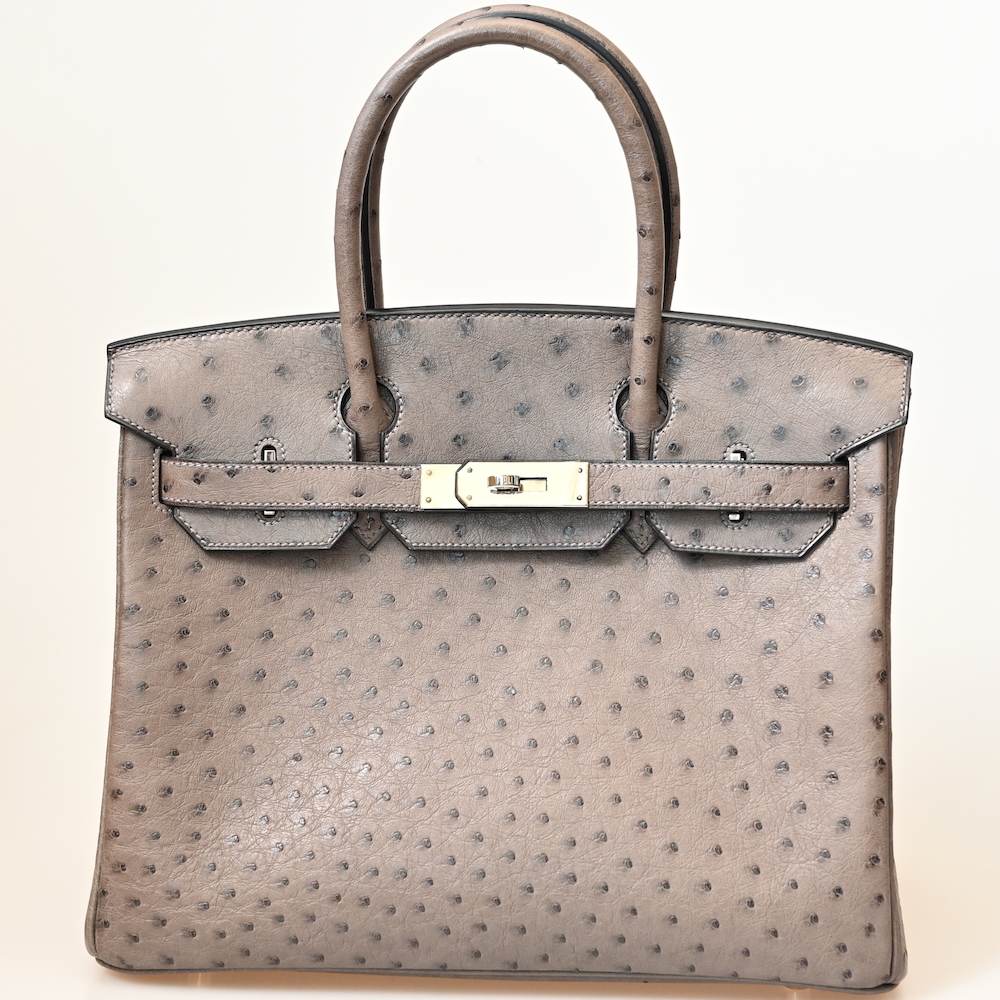 エルメスのバーキン30をお買取させていただきました。オーストリッチ素材のバーキンは定番のチェスナッツやオレンジといったカラーの展開が多く、グレー系のカラーのモデルは珍しいです。今回ご依頼いただいたお品物はムースというカラーのモデルとなりますが、通常のレザー素材で用いられるエタンに似たダークグレー系のカラーとなり中古市場でも人気が高いとご評価させていただきました。状態に関しては年数が経っているため多少の角擦れなども見られましたが、ご使用回数が少なかったためかハンドルなどに使用感が少なくABランクでのご評価とさせていただき、125万円にてお買取させていただきました。