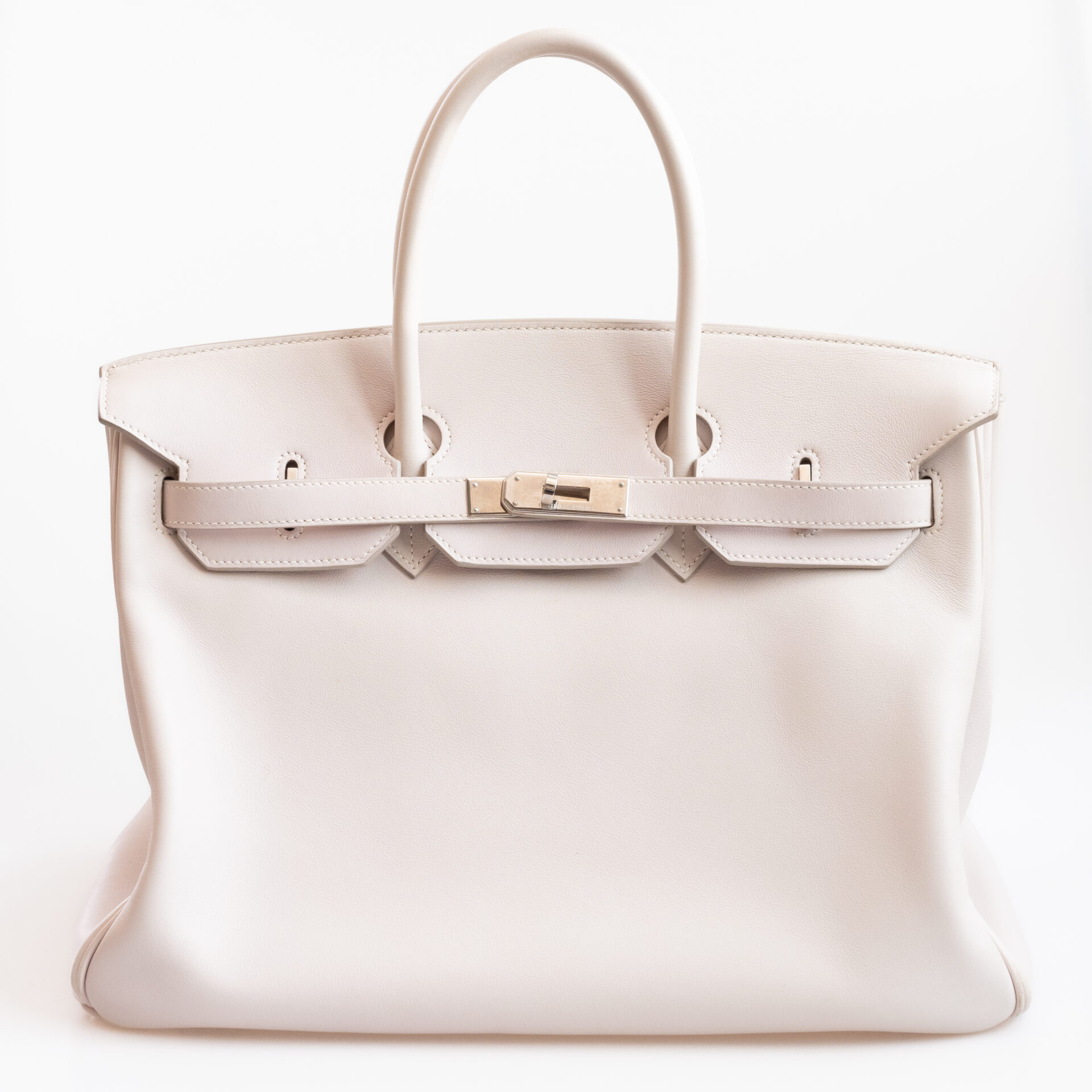 エルメスのバーキン35をお買取させていただきました。ローズドラジェのカラーでピンク系の中でももっとも薄いカラーとなっています。白に近く汚れがやや目立ちやすく中古品となってしまうとどうしてもお値段がつきづらい部類にはなっています。今回ご依頼いただいたお品物はスイフト素材のモデルでかなり使用感やシミなども見られたため状態に関してはマイナスな評価が多くなってしまいました。バーキン35サイズでスイフト素材はかなりお値段がつきづらいバーキンではありますが、最新の相場を考慮し70万円にてお買取させていただきました。
