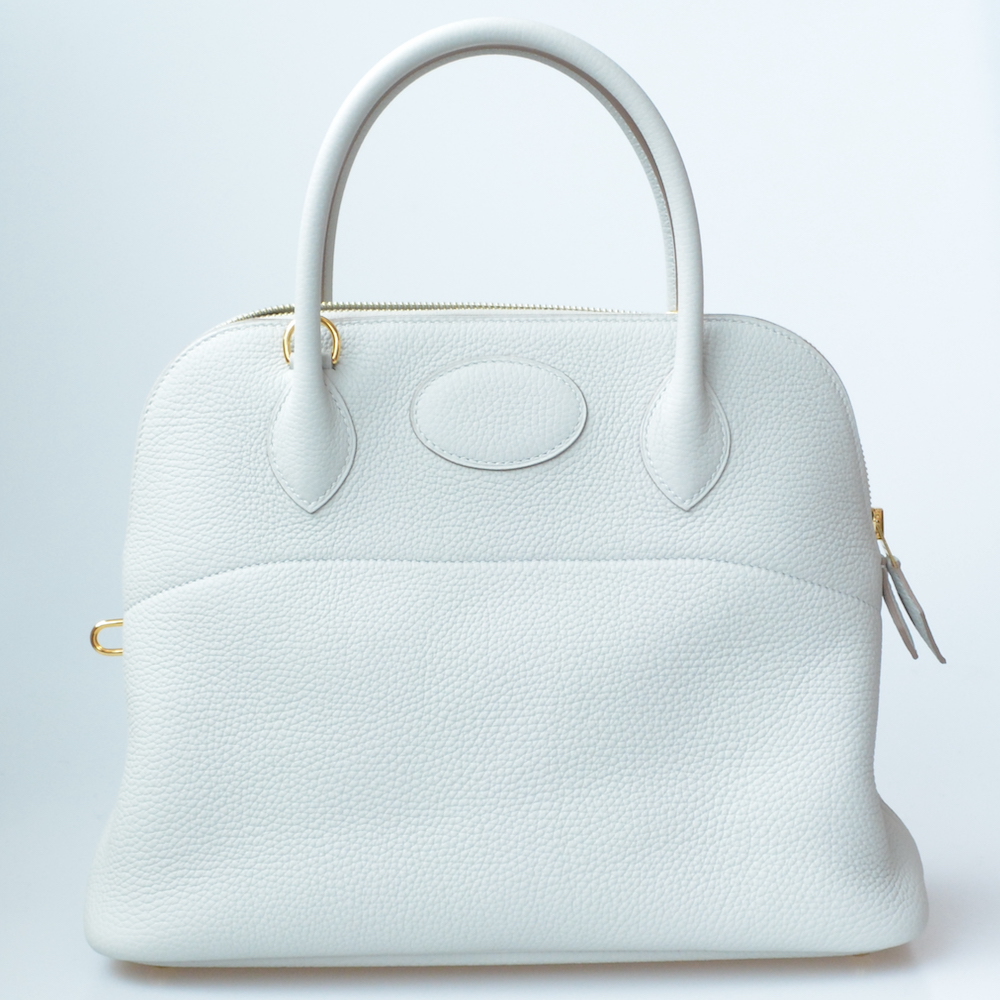エルメスのボリード31をお買取させていただきました。ボリードは現在1923モデルの生産が増えており、通常のボリードはやや入手しづらくなりつつある状況から、中古相場もやや高騰している傾向にあります。もっとも小さいボリード27が定価も安くリセール率には一番優れているものの、ボリード31も人気は高く買取相場も高い水準となっています。今回ご依頼いただいたお品物は未使用品のボリード31でグリペールというややグレーがかったホワイト系の人気カラーです。モノトーン系のカラーはいつの時代も人気が高く、特にゴールド金具のお品物は流通数が少ないため高くご評価させていただきました。