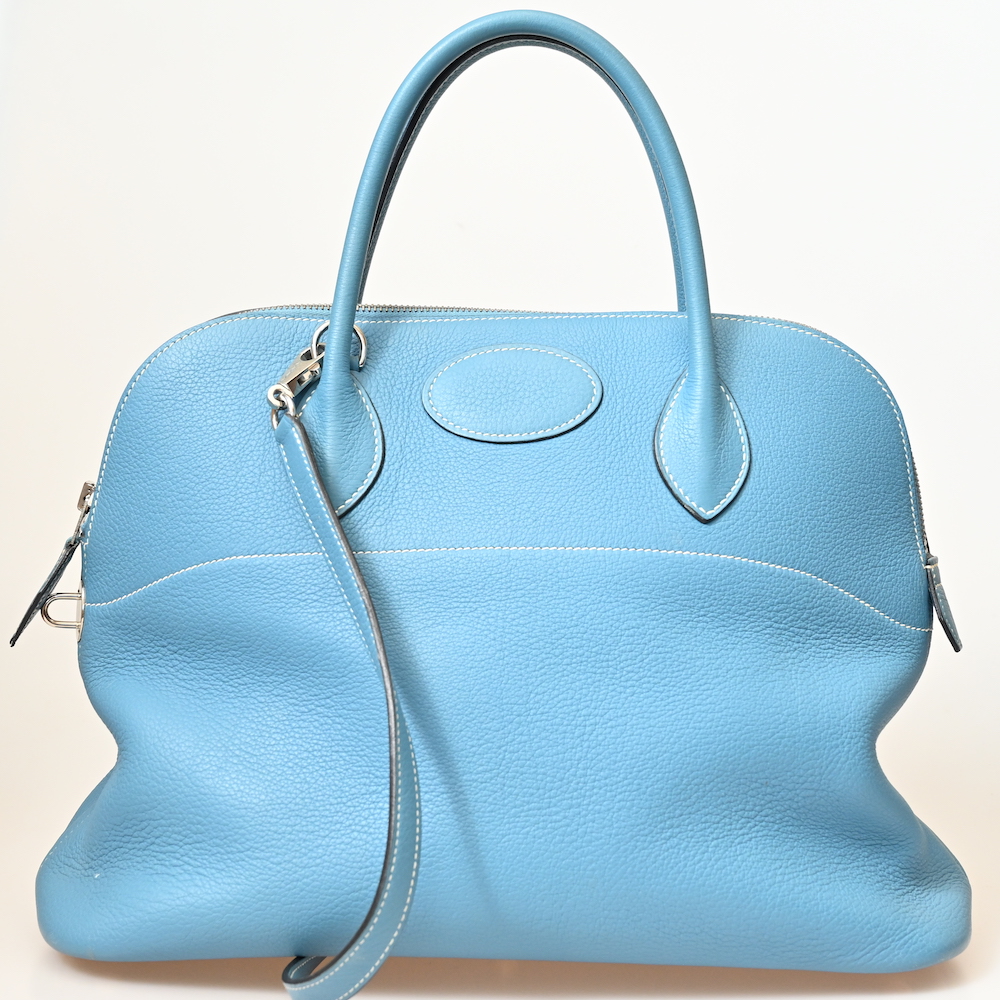 エルメスのボリードをお買取させていただきました。35cmのモデルでボリードの中では大型なモデルに分類されます。ボリードは現行品は27cm,31cmモデルがほとんどで35cm以上のモデルはほとんど生産されていませんが、中古市場においては小型のモデルの人気が高い一方、ボリード35以上のサイズは極端に需要が下がってしまう傾向にあります。今回ご依頼いただいたお品物はブルージーンのカラーで製造年はやや古めではあるものの使用感も少なく全体的にABランクとご評価できる美品ではありましたが、どうしても中古市場においては人気が低いため18万円にてお買取させていただきました。