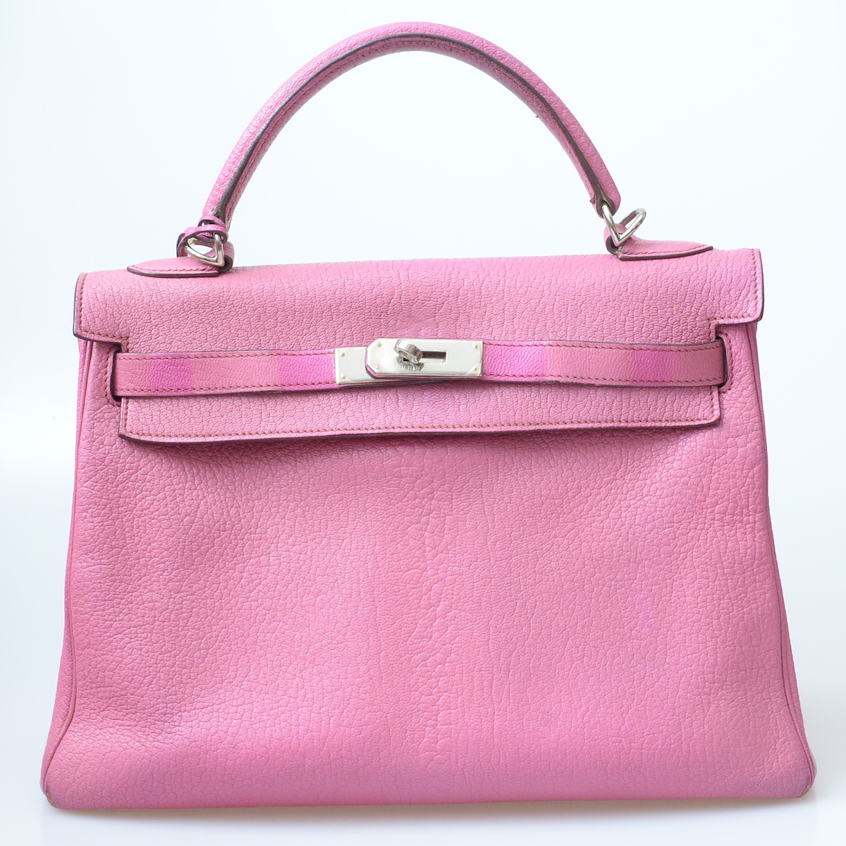 ケリー32のローズショッキングのお色をお買取させていただきました。今回ご依頼いただいたケリーは使用感がかなり見られるお品物で、角擦れやハンドルの黒ずみなどの他にも、型崩れや全体的な色焼けなども確認できました。シェーブルのお素材は比較的柔らかめのレザーではありますが、一度雨に濡れて染み込んでしまったように革素材の硬質化も起きていました。ここまで状態が悪くなってしまうと回復も難しいため、かなりお値段が付きづらいというのが正直なところです。ショルダーストラップも欠品していたためその分もマイナス評価となってしまいました。ただヴィンテージと呼ぶほど古い製造ではなく、金具も新型のものという点を踏まえ26万円にてお買取させていただきました。