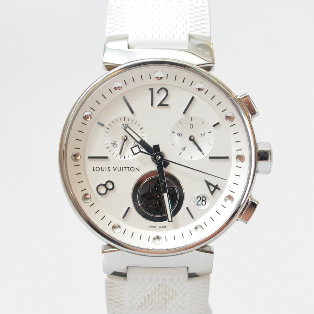 ルイヴィトンのタンブールムーンスターのレディースMMサイズをお買取させていただきました。ルイヴィトンの腕時計の定番モデル「タンブール」ですが中古市場での人気は今ひとつとなっています。定価が高いモデルであっても買取率は平均20%前後となっており、高級腕時計の中ではリセール率は悪いと言わざるを得ません。今回ご依頼いただいたお品物はレディースのクロノグラフモデルとなっていて、通常のモデルよりもやや高価な品物ではありますが、状態や相場等を考慮し105,000円にてお買取させていただきました。