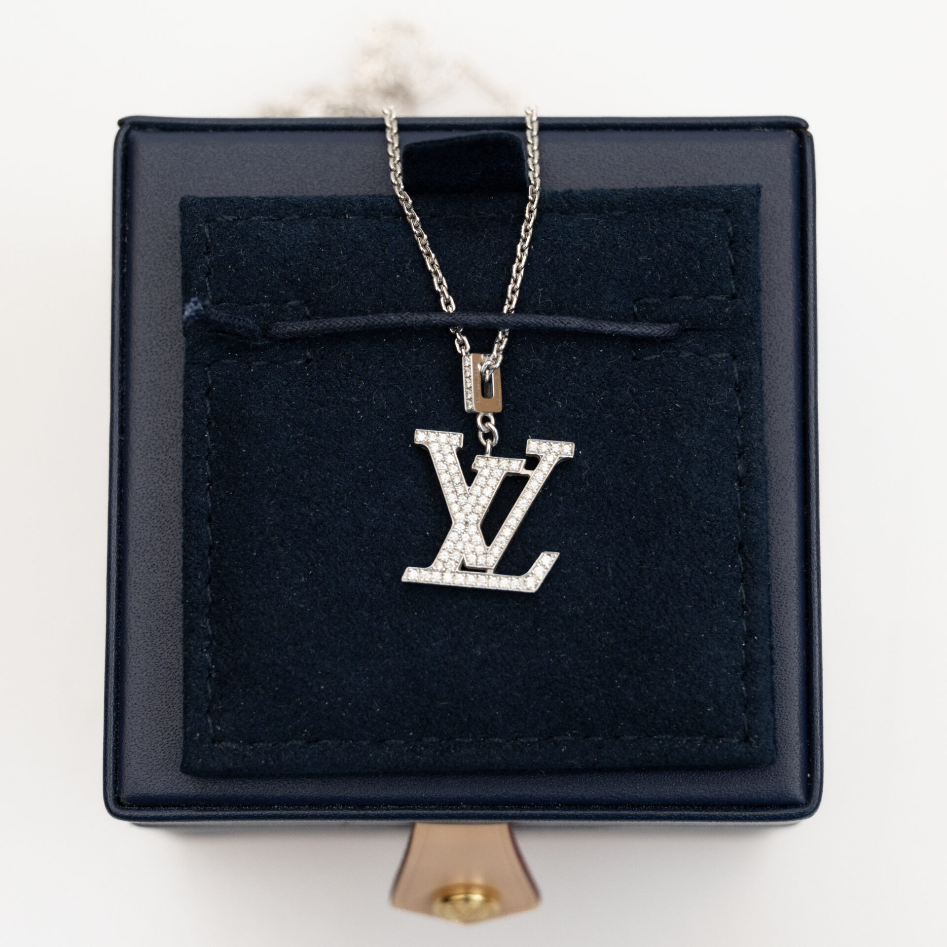 ルイヴィトンのパンダンティフLV GMをお買取させていただきました。ルイヴィトンのハイジュエリーの中でも定番のモデルで、K18ホワイトゴールド製のLVロゴにダイヤが散りばめられた豪華なお品物です。同型でXLというさらに大きなサイズのモデルもありますが、こちらの方がより一般的なモデルとなっています。今回ご依頼いただいたお品物は若干の小傷等は見られましたが、許容範囲内のわずかな傷と判断させていただきました。どうしてもルイヴィトンのハイジュエリー製品は定価に対して買取価格が下がってしまう傾向にはございますが、LVロゴモチーフの定番のモデルである点を考慮し48万円にてお買取させていただきました。