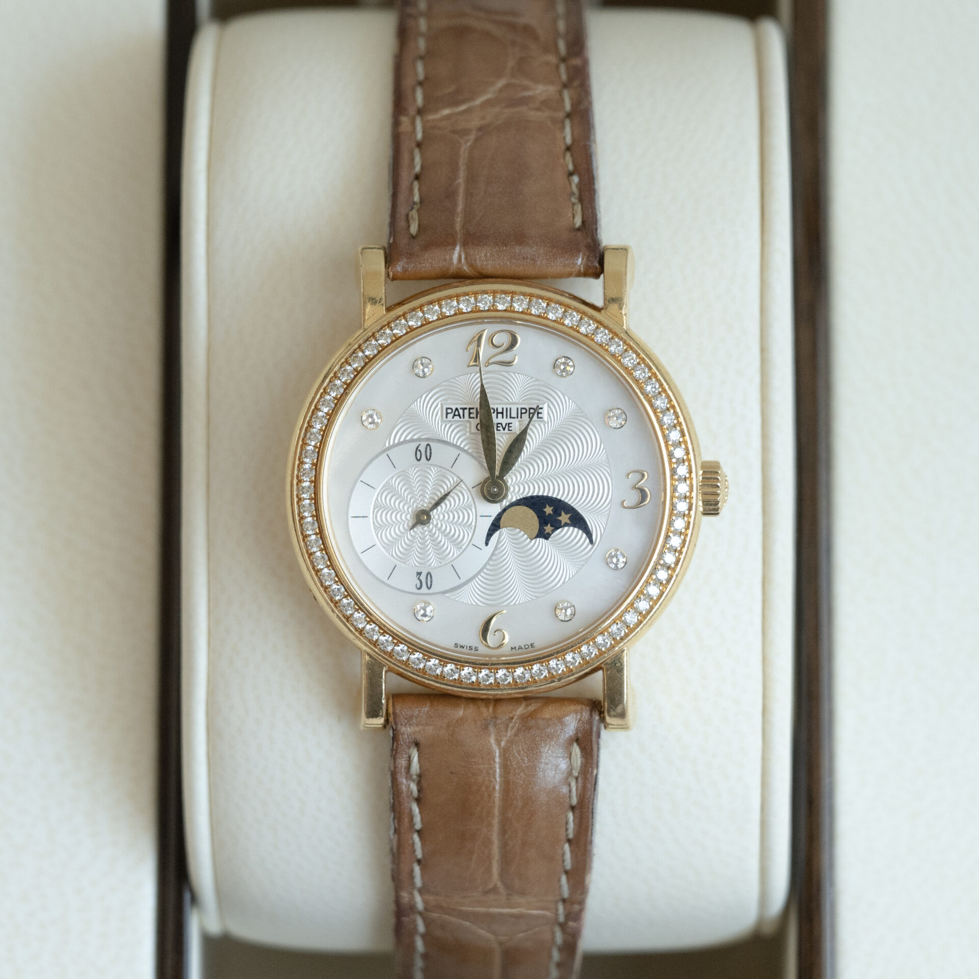 パテックフィリップのレディースカラトラバをお買取させていただきました。通常のモデルよりもベゼルにダイヤモンドが装飾された豪華なモデルで、文字盤もムーンフェイズ仕様となっています。パテックフィリップに関しては、ラグジュアリースポーツを代表する「ノーチラス」「アクアノート」など入手困難なモデルが中古市場で極めて人気が高く高価となっており、カラトラバなどのドレスモデルはやや人気が低い傾向にはありますが、ブランドの認知度やステータス性は腕時計ブランドの中でももっとも高く評価されており、全てのモデルの相場は高騰傾向にあります。今回ご依頼いただいたお品物は若干の使用感が見られましたが、箱や保証書等の付属品が揃っている点などを高くご評価し130万円にてお買取させていただきました。