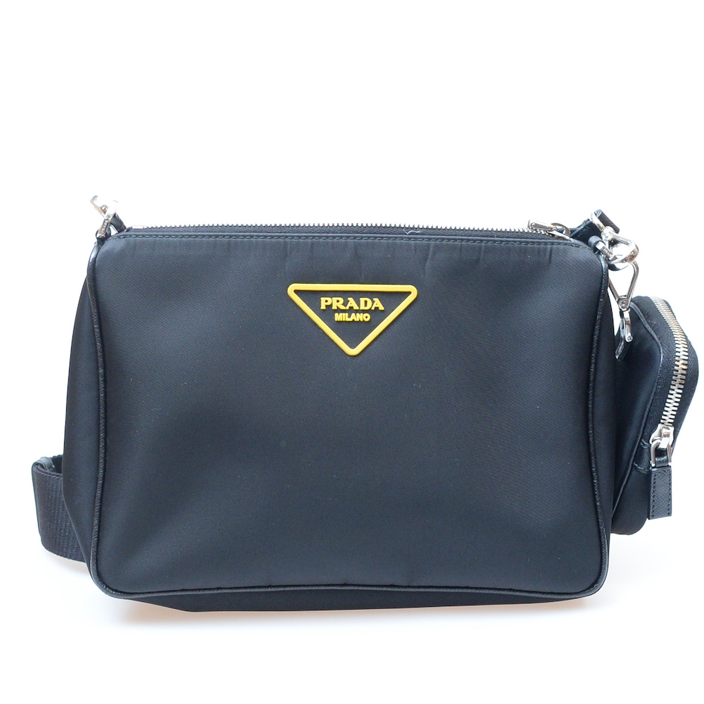 プラダのナイロンショルダーバッグをお買取させていただきました。ミニポーチが付属するかなり新しいモデルですが、デザイン自体はロゴプレート付きの往年のナイロンショルダーバッグを復刻したようなバッグとなっています。ロゴ部分が金属製のプレートではなく、イエローの樹脂製となっている点もポイントです。今回ご依頼いただいたお品物やナイロン部分にやや使用感やヨレが見られたためABランクとご評価させていただきました。