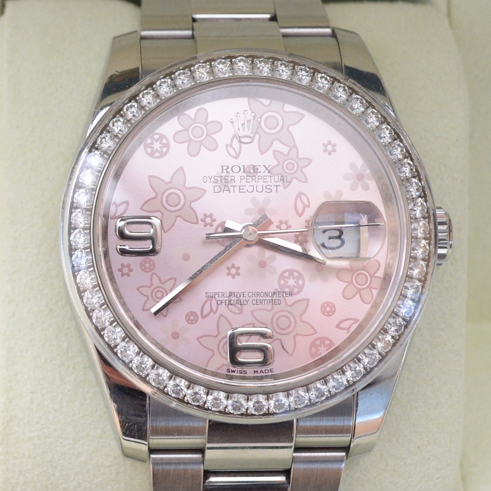 ロレックスのデイトジャスト36をお買取させていただきました。36サイズは一般的にはボーイズサイズとされていますが、レディースでも使用できるサイズ感となっております。デイトジャストはロレックスの中でも定番のドレスウォッチではありますが、ベゼルにダイヤ入りの豪華モデルである点や文字盤が珍しいピンク色でフラワーデザインである点を高くご評価させていただきました。傷や使用感は見られましたが、近年ロレックスの相場が高騰していることも考慮し101万円にてお買取させていただきました。