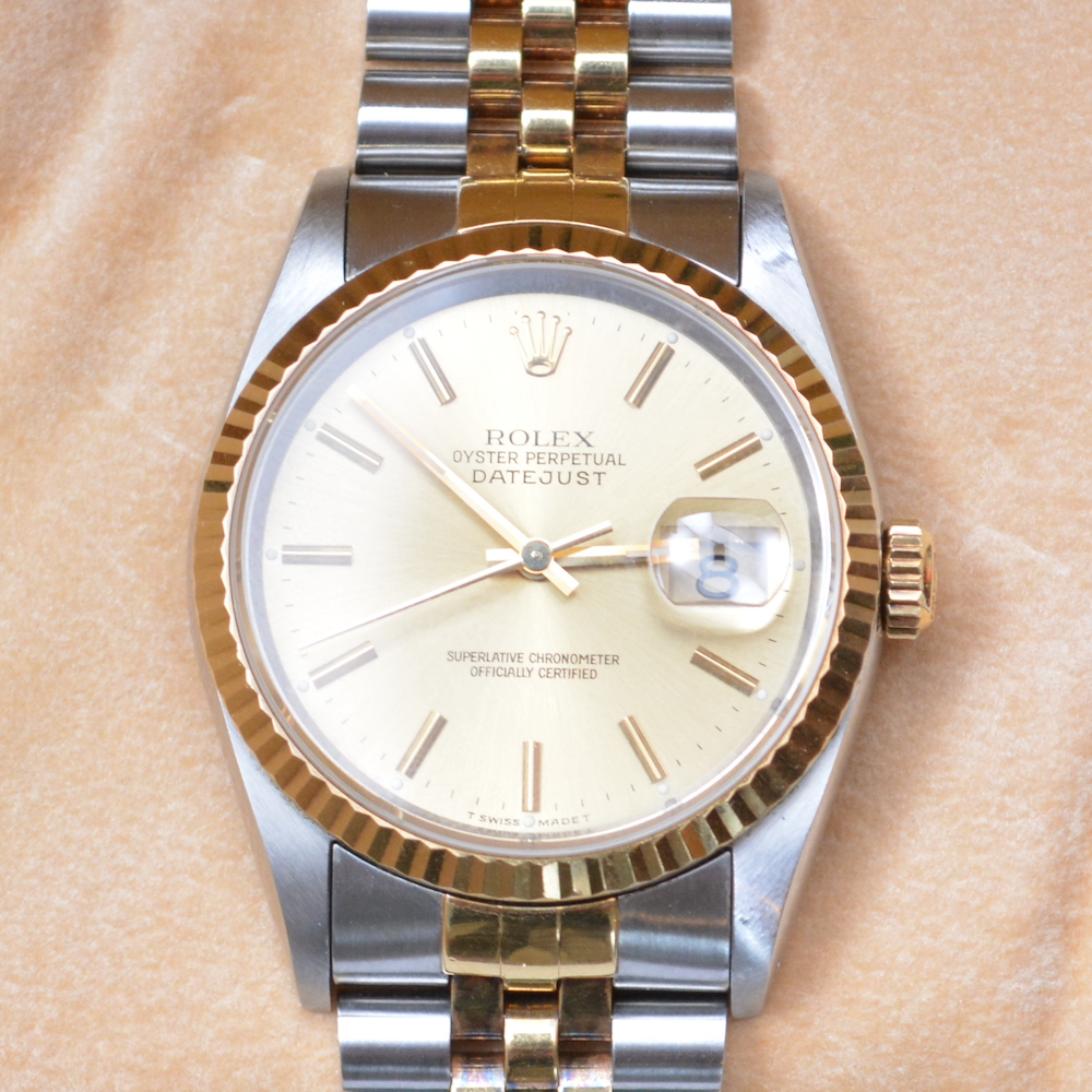 ロレックスのデイトジャスト(16233G)をお買取させていただきました。やや古めのコンビタイプではありますが、36mmのメンズサイズということで若干相場が高騰傾向にあるモデルとなります。ロレックスは全体的に相場高騰が取り沙汰されていますが、主にメンズ需要の高い定番モデルの相場が高騰していてレディースモデルに関してはそこまで大きく高騰していないモデルの方が多数です。デイトジャスト自体は現在正規店での購入が難しくなっているため、古い品物でもやや相場が高騰しています。今回ご依頼いただいたお品物は付属品も全て揃っており、かつこの年代のお品物にしては状態も良好と高くご評価させていただきました。