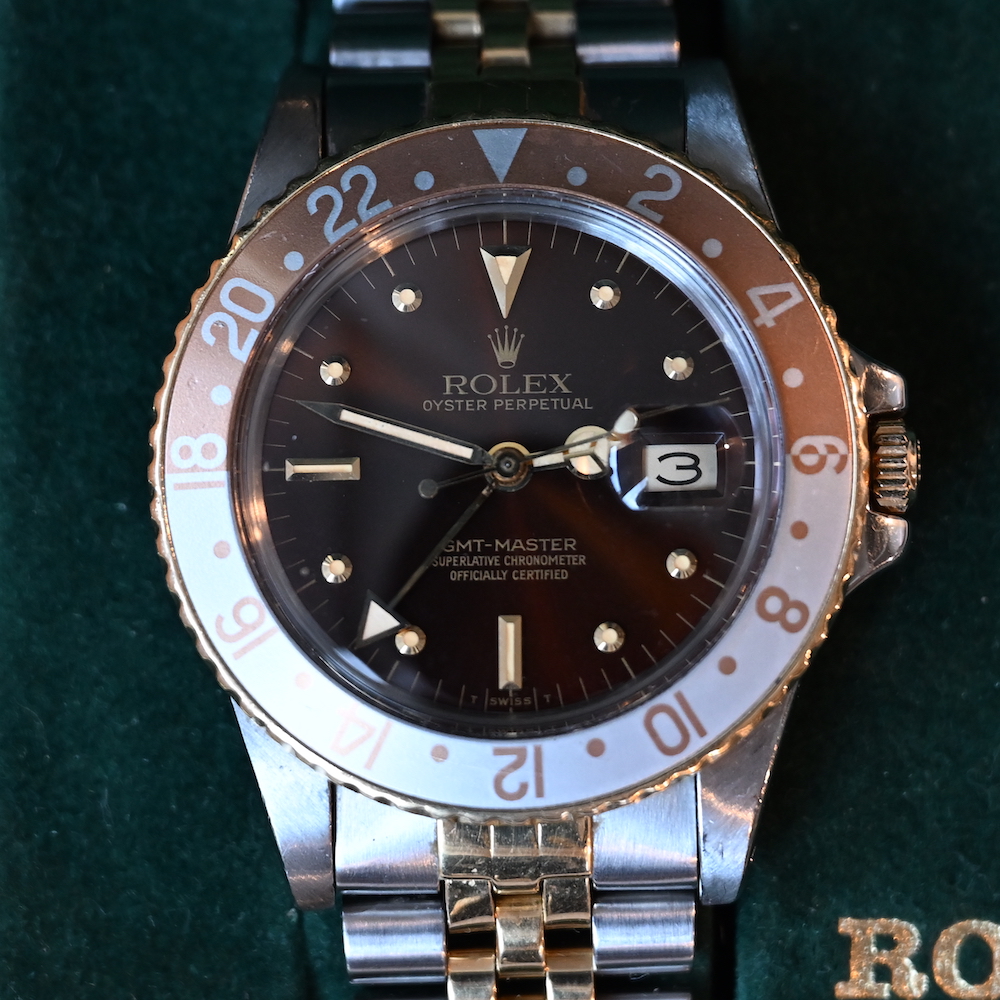 ロレックスのGMTマスター(16753)をお買取させていただきました。インデックスに現行品ではないメタルパーツが使用されており通称フジツボ、ニップルダイヤルなどと呼ばれて人気が高いヴィンテージのスポーツモデルとなっています。ロレックスのコンビモデルはオールステンレスモデルと比較するとややお値段がつきづらい傾向にはありましたが、近年ロレックスの相場の高騰も激しく、コンビモデルやK18無垢モデルも総じて買取相場が上昇しています。今回ご依頼いただいたお品物は40年近く前のモデルで小傷やベルト部分の垂れなども見られましたが、文字盤部分などには大きく傷や汚れがなくBランクでのご評価とさせていただきました。保証書はありませんでしたが、当時の希少な純正の箱などがあったことも高くご評価させていただき135万円にてお買取させていただきました。