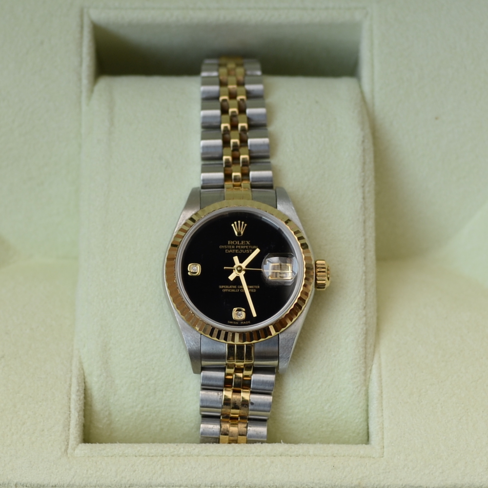 ロレックスのレディースの定番モデルであるデイトジャスト。素材や文字盤など種類も多くそれぞれ買取相場も異なります。今回ご依頼いただいたお品物は文字盤に2ポイントのダイヤモンドを使用したモデルで、文字盤12ポイントのダイヤのモデルが一般的ですが、こちらのモデルは比較的珍しいお品物です。そのため通常のダイヤなしモデルよりも少し高くご評価させていただいております。