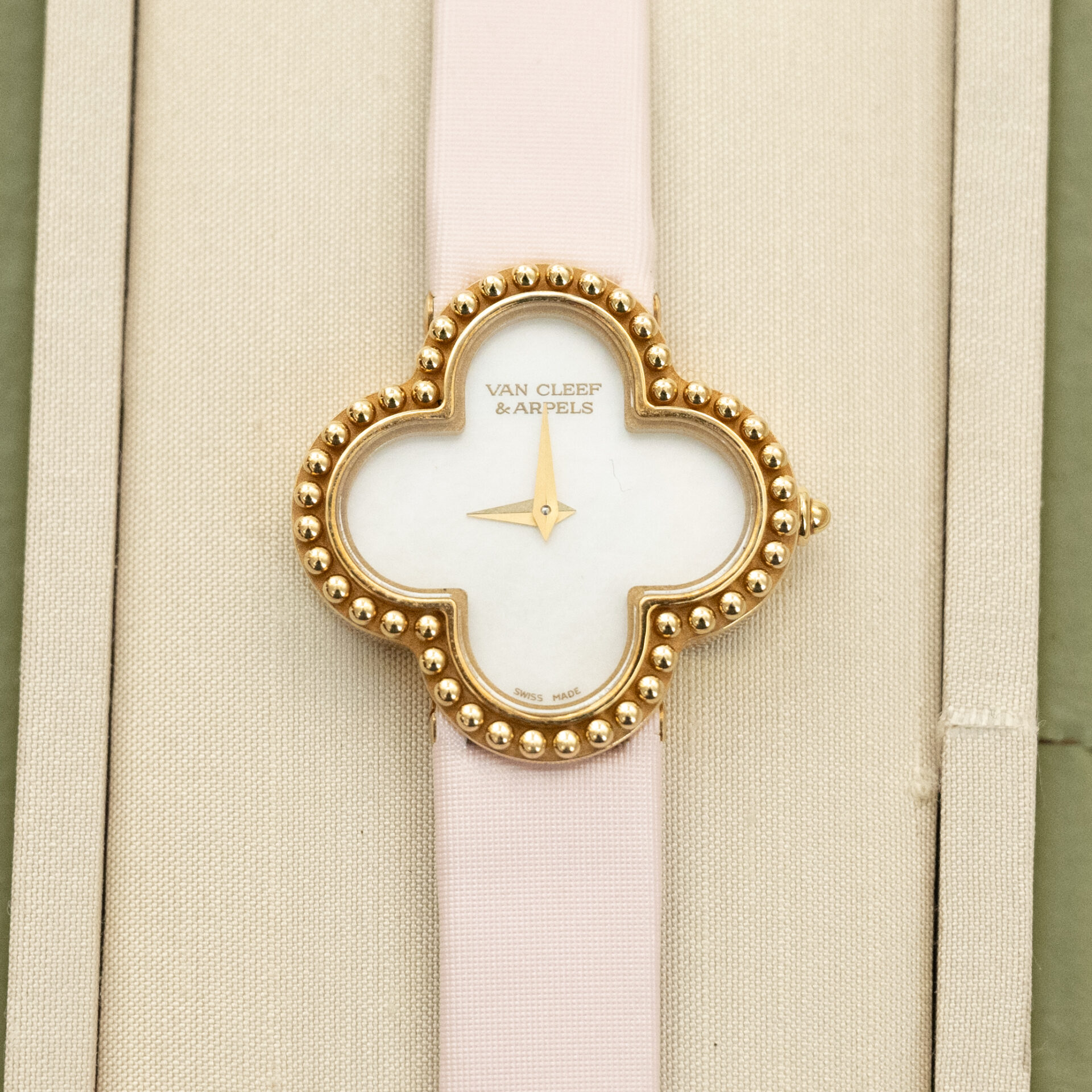 ヴァンクリーフ&アーペルのアルハンブラウォッチをお買取させていただきました。現在アルハンブラのジュエリー類は中古市場での人気が非常に上がっており、ここ二年間くらいの間に相場も大きく高騰しました。今回ご依頼いただいたお品物はやや古めのお品物ではありましたが、定番のアルハンブラモチーフの腕時計という点で高くご評価させていただきました。文字盤部分にはオニキスなど多数の素材で展開されていますが、もっとも定番であるマザーオブパールのモデルは中古市場でも人気が高く高値がつきやすいモデルとなっております。腕時計全体で見るとメンズ向けの機械式のモデルがリセールバリューは優れている傾向にありますが、レディースウォッチの中ではヴァンクリーフ&アーペルはリセールリューも高い部類であるかと思います。